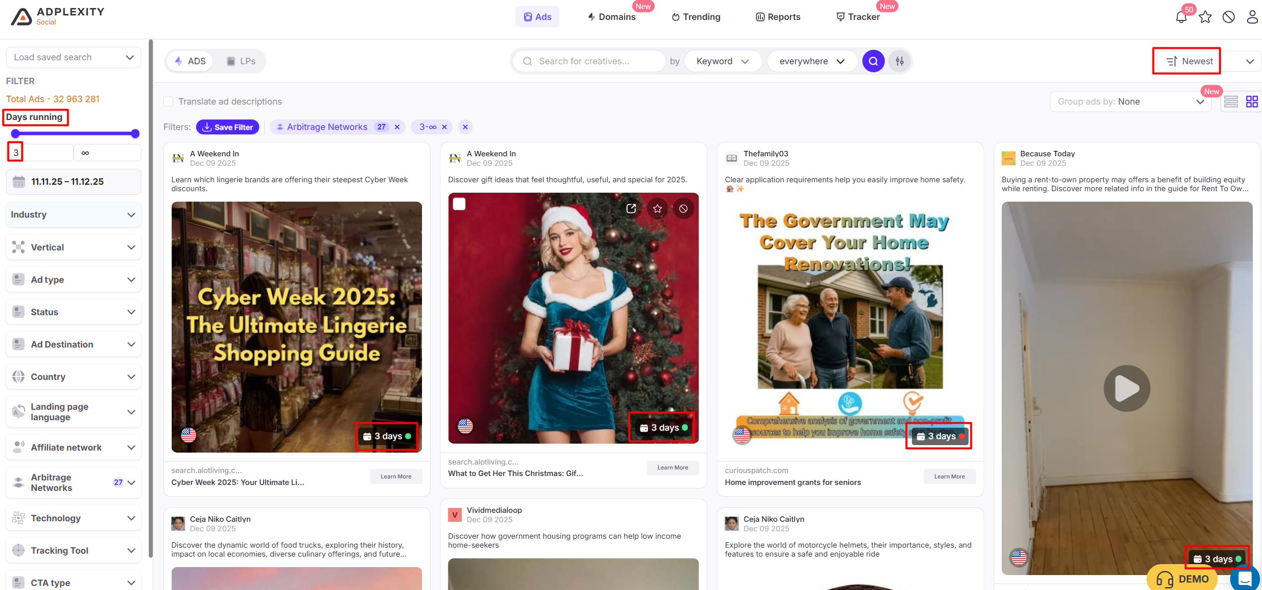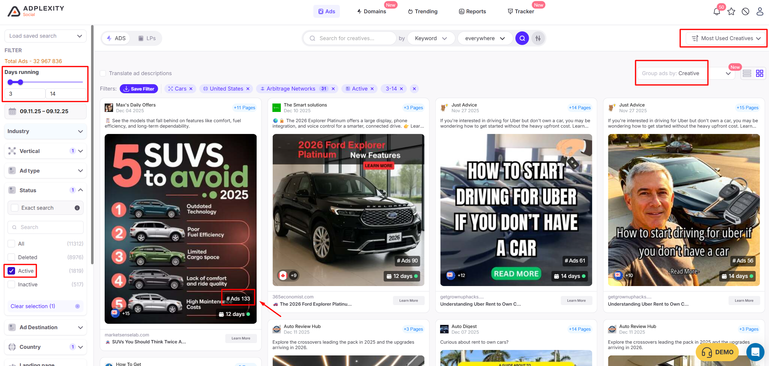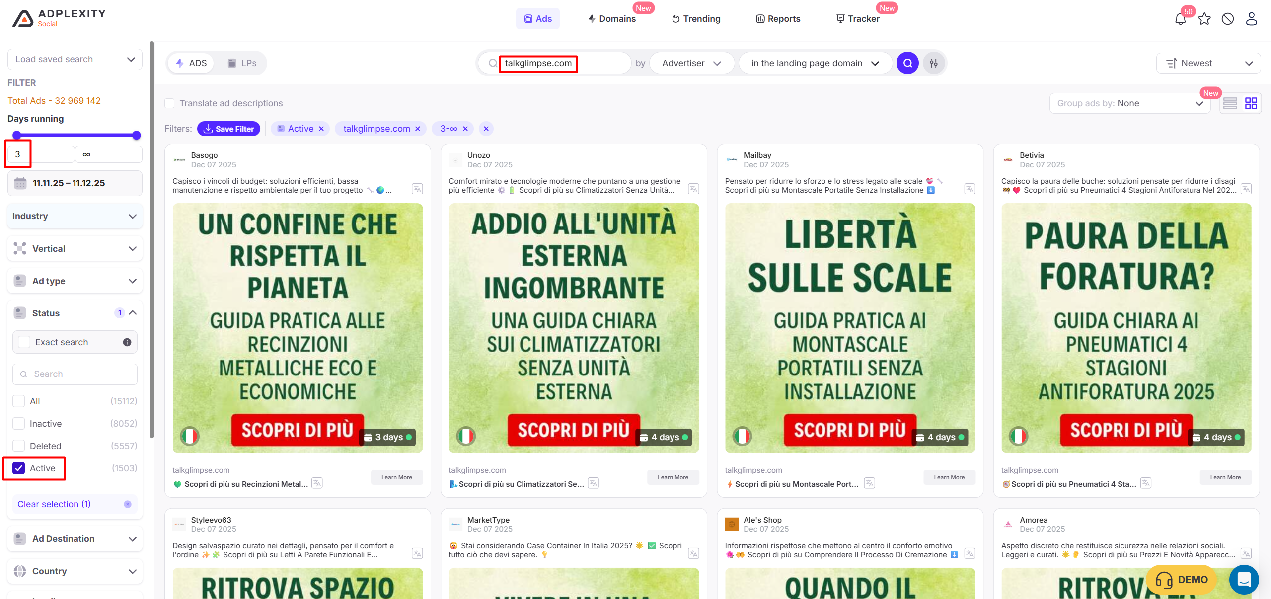Open any domain → view all ads → filter by “Active” → you instantly see what is passing their internal testing framework.