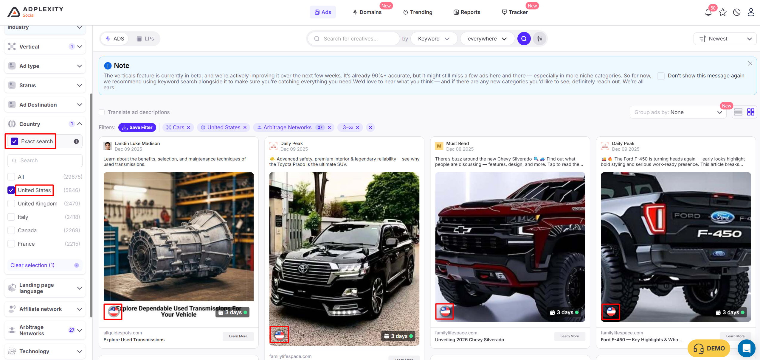 *TIP – Use our exact match filter to remove all multi-geo campaigns and focus only on ads built for a specific country.
