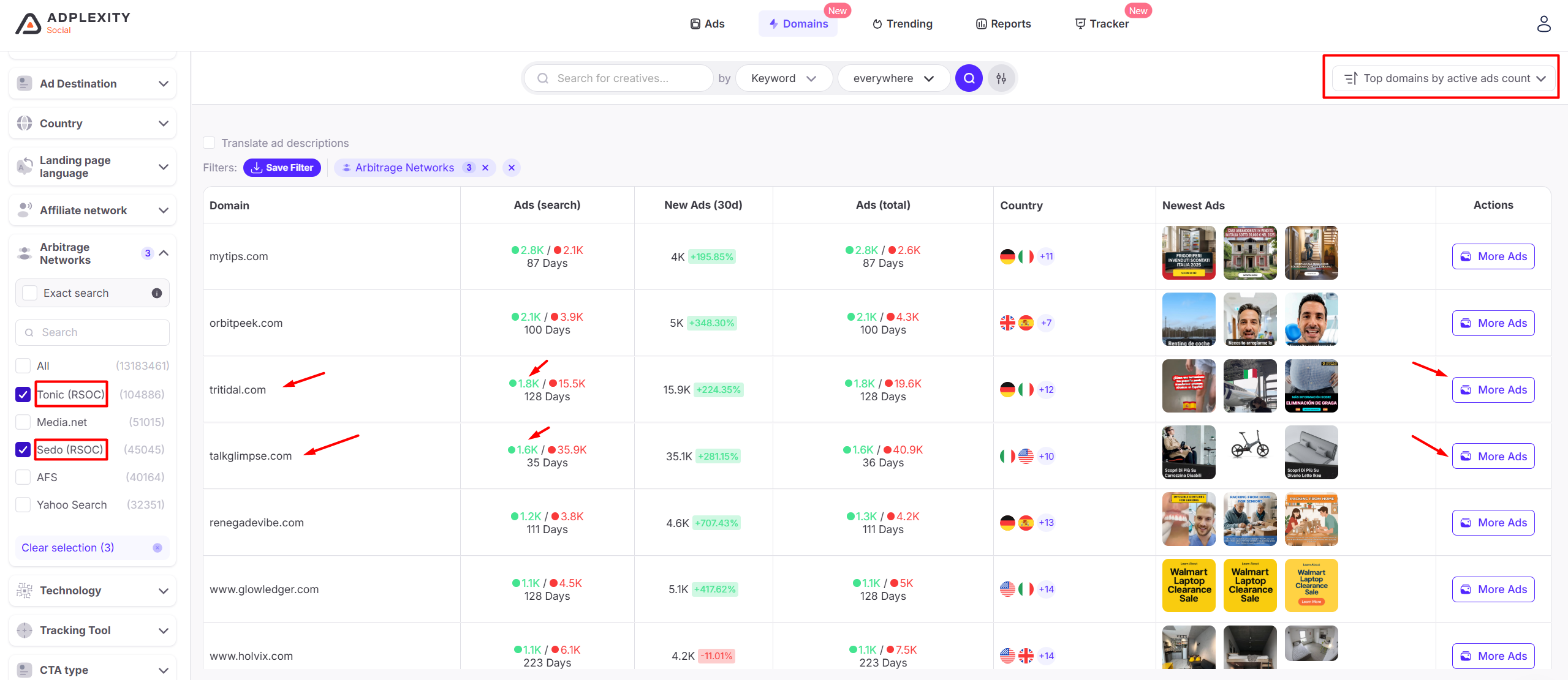 - Which domains launched the most ads in the last 30 days